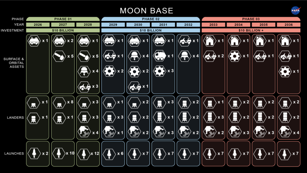- Three-Phase Moon Base: Carlos Garcia Galan, who serves as the Moon Base Program Executive, outlined a phased approach to a permanent surface base, backed by $20 billion: Phase 1 (robotic experimentation, now–2029), Phase 2 (primary infrastructure, 2029–2032), and Phase 3 (habitation, 2032-).