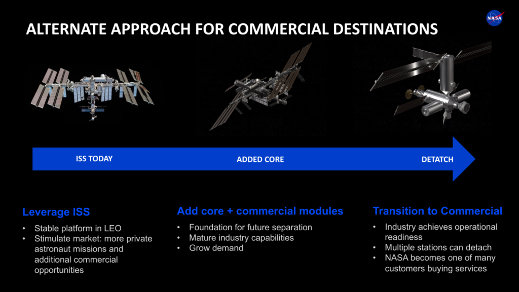 - The ISS-Anchored Solution: Unable to shoulder the cost and execution risk of procuring from a single commercial provider in an uncertain market, an alternative was proposed. They are exploring the procurement of a government-owned Core Module to attach to the ISS. Commercial modules would dock to this core to mature their capabilities using the ISS as a safe haven before eventually detaching into free-flight.